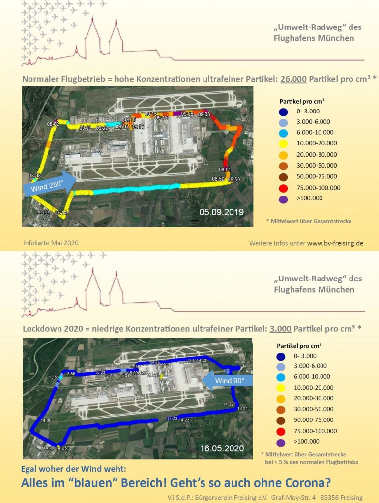 Kaum Flugverkehr – eine Gelegenheit für Vergleichsmessungen. Hier die Ergebnisse am Beispiel des „Umweltradwegs“ eund um den Flughafen. Verteilt an alle regionalen und Landespolitiker als BV Freising Postkarte 14.
