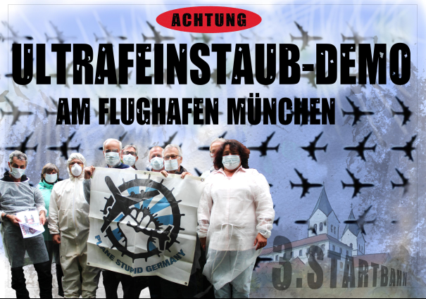 Plane Stupid veranstaltet am Donnerstag, 18. Mai (19 -20 Uhr) eine Demonstration am Flughafen und ruft alle Startbahngegner zur Teilnahme auf. Ziel und Zweck der Demo ist es, die verantwortlichen Politiker auf die vom Flughafen ausgehende Belastung mit ultrafeinen Partikeln (UFP) aufmerksam zu machen. Der BV Freising unterstützt diese Aktion. Messungen des BV Freising zeigen am Flughafen und im Umland des Flughafens hohe Konzentrationen von UFP in der Atemluft. Die Demo-Teilnehmer werden Staubmasken tragen, um auf die gesundheitlichen Gefahren hinzuweisen, die vom Ultrafeinstaub ausgehen. Obwohl entsprechende Studien die Gesundheitsrisiken von Ultrafeinststäuben belegen, scheint das Thema für die FMG mit der Verweis auf fehlende gesetzlichen Vorschriften erledigt zu sein. Täglich werden am Flughafen München mehr als 500.000 Liter Kerosin verbrannt; dabei entstehen unzählige Trillionen ultrafeiner Partikeln die mit dem Wind auch in bewohntes Gebiet verfrachtet werden. Mit dem Bau einer 3. Startbahn soll der Ausstoß weiter erhöht werden.