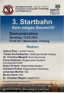 Darum ging es bei der Demo am 15.02.2025: In der vom Aktionsbündnis aufgeMUCkt initiierten Großveranstaltung, unterstützt auch vom Bürgerverein Freising, wird die beispiellose Vorgehensweise von Flughafenmanagement & Regierung von Oberbayern aus der Sicht der Betroffenen erläutert (s. Programm).
