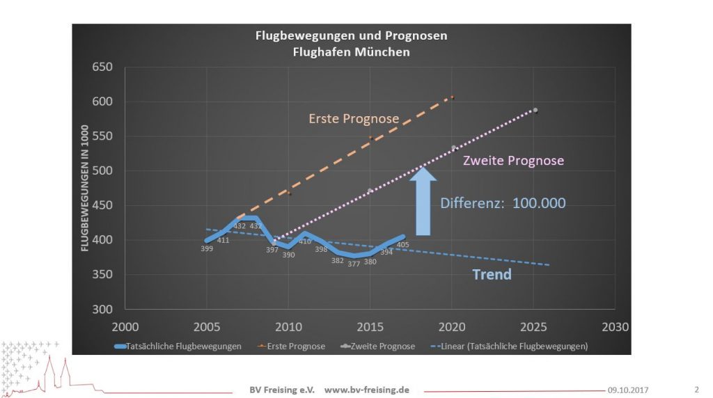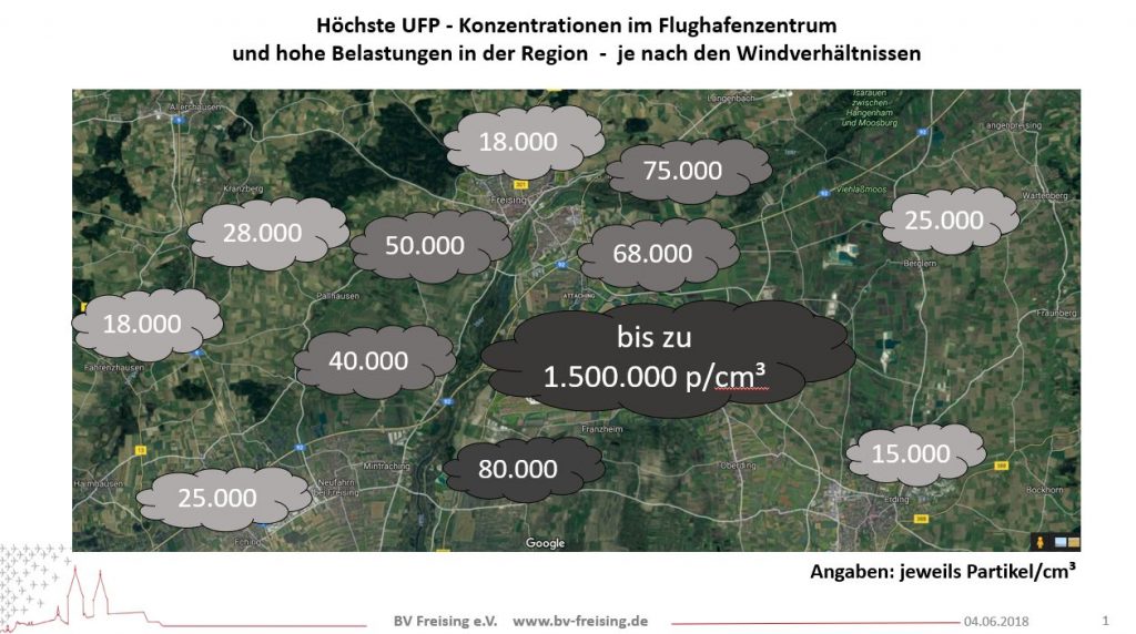 Der BV-Freising setzt seine Serie über die Ultrafeinstaub-Belastung in der Flughafenregion fort. Gestern nach dem Fußballspiel Deutschland gegen Mexiko kamen viele interessierte Hohenbachener ins Schützenheim und waren sowohl beeindruckt wie auch betroffen von den enormen Emissionen, die der Flughafen verursacht. Während der regen Diskussion kam auch deutlich heraus, was die Freisinger mit einer dritten Startbahn an zusätzlichen Belastungen erwarten müssten. Dabei zeigt sich überhaupt kein Bedarf an mehr Flugbewegungen, wie die Grafik (Abbildung 1) zeigt. Hingegen würden sich die UFP-Konzentrationen, die bei entsprechendem Wind gemessen werden, mit einer dritten Bahn deutlich erhöhen (Abbildung 2).