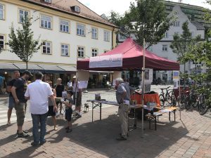 Im Vorfeld der Veranstaltung mit Frau Prof. Dr. Annette Peters am kommenden Donnerstag den 11. Juli um 18:30 im Grünen Hof in Freising informierte der BV Freising die Freisinger Bürger an seinem Infostand am Kriegerdenkmal über die Problematik ultrafeiner Partikel die in großen Mengen von den rollenden Flugzeugen ausgestoßen und mit dem Wind ins Umland verfrachtet werden.