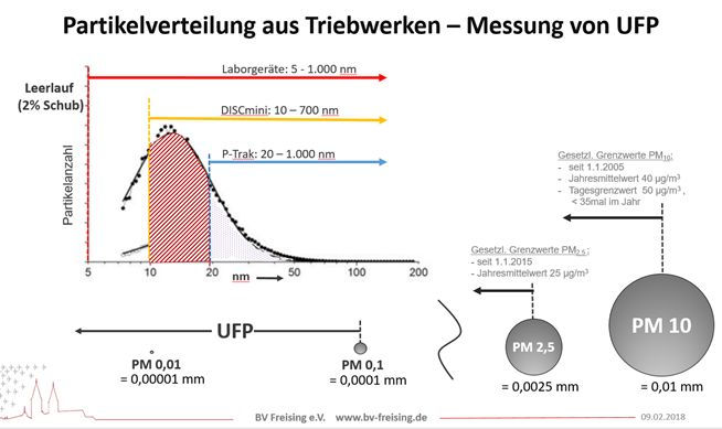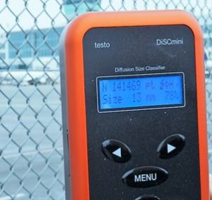 Die Abgase von Flugzeugturbinen haben einen hohen Anteil an feinsten Partikeln. Dieser kann mit dem Messgerät DiscMini erstmals erfasst werden (bis 10 nm).