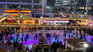 Wintermarkt im München Airport Center (MAC) mit Schlittschuhbahn und Kinderkarussell im Hintergrund am 28.12.2023.(Bild: BV/gms)