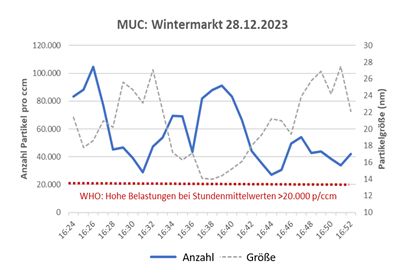 Die beiden Passanten sind Vorsitzende des Bürgervereins Freising zur Vermeidung von Lärm und Schadstoffbelastungen e.V. (BV Freising). Ihr Rundgang am späten Nachmittag des 28.12.2023 führt sie auf der unteren Ebene um den Wintermarkt herum, hinein bis zum Kinderkarussell, dann auch oben auf der Galerie rings herum. Die Gehstrecke wird GPS-markiert. Das Gerät erfasst jede Sekunde die Konzentration der UFP und zeigt Werte zwischen 25.000 und 110.000 Partikel pro Kubikzentimeter (cm3). Der von der Weltgesundheitsorganisation (WHO) als hohe Belastung und damit wohl als gefährlich für die menschliche Gesundheit eingeschätzte Wertebereich beginnt bei Tagesmittelwerten von > 10.000 Partikeln/cm3 und bei Stundenmittelwerten von > 20.000 Partikeln/cm3.